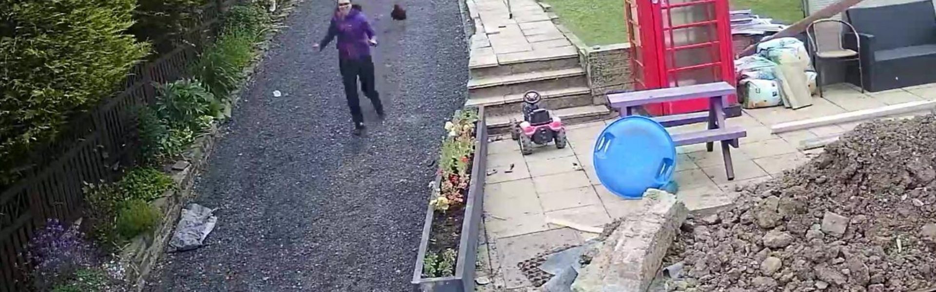 The angry bird then jumped over the fence, chasing the pair down the garden path to their house – filmed by the house CCTV